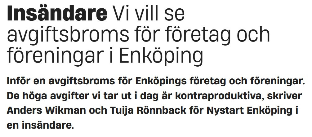 Ur insändaren: Välfärden i Enköping står och faller med våra företag och våra ideellt arbetande föreningar. Samtidigt har vår kommun på senare tid höjt en mängd avgifter för just företag och föreningar. Vi i Nystart Enköping tycker inte att den politiken går ihop.
