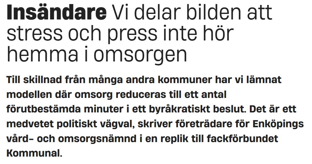 Eftersom personalen inom hemtjänsten verkar vara av en annan uppfattning, (”Daglig jakt på klockslag är minutstyrning – säg inget annat”) misstänker jag att minoritets-politikerna drar lite för stora växlar på den information de fått i nämnden. Liksom att de inte riktigt förstått skillnaden mellan den övergripande inställningen om större flexibilitet hos dem som har hemtjänst, och det faktiska arbetet i verkligheten som fortfarande ofta styrs av klockan.